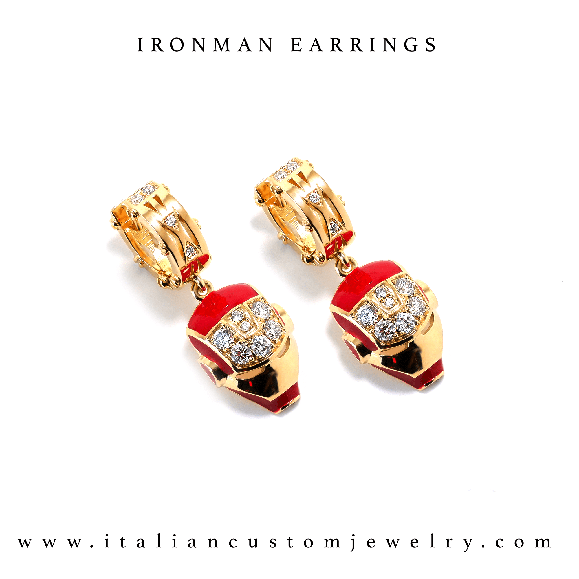 Una meravigliosa coppia di orecchini ispirata ad un famosissimo supereroe, Ironman. Il gioiello è completamente fatto a mano in oro giallo con diamanti naturali incasotnati. Un pezzo unico disegnato dalla Gioielleria Appolloni Roma. Il prodotto è compreso di scatola e certificato di garanzia. Tempi di conmsegna entro cinque giorni lavorativi.