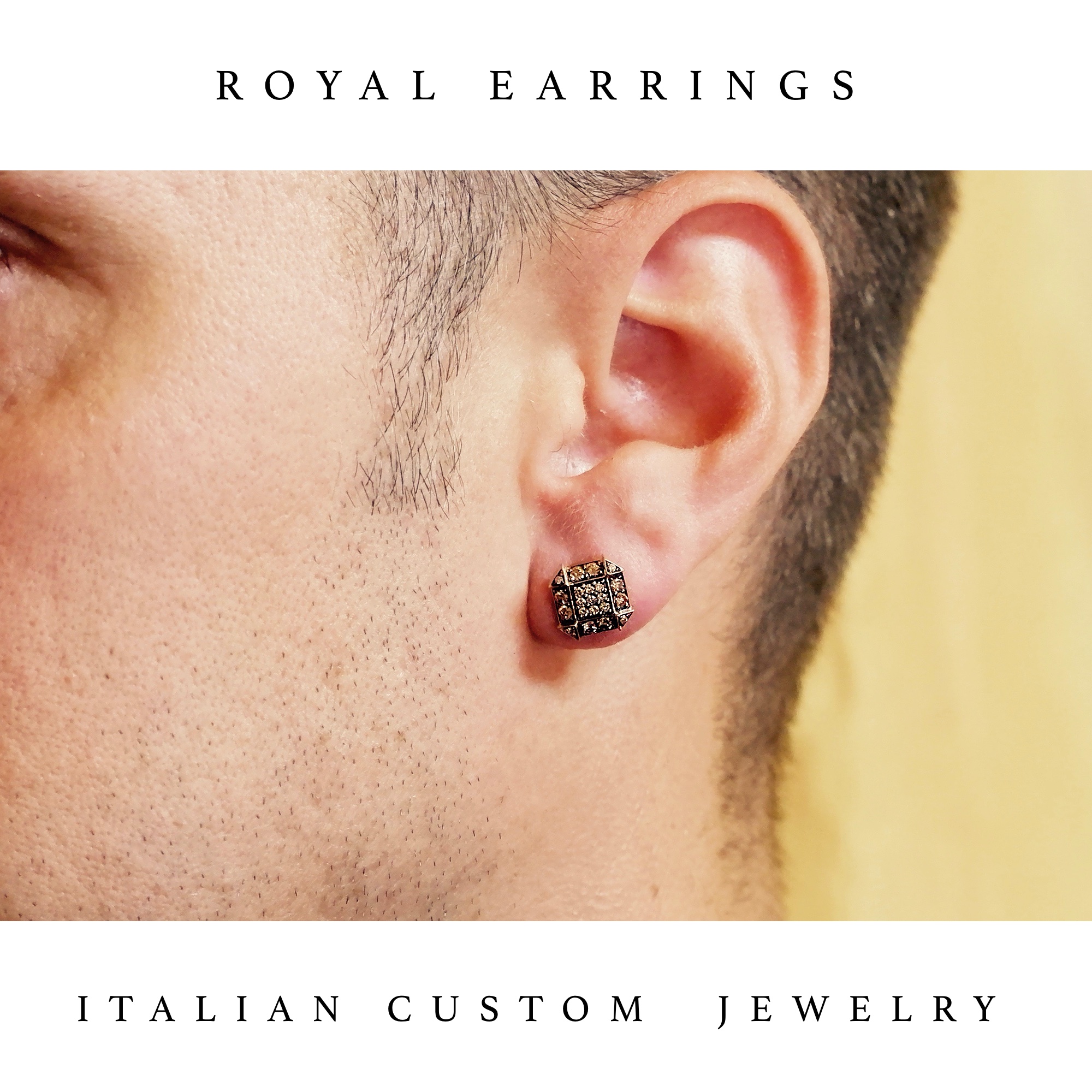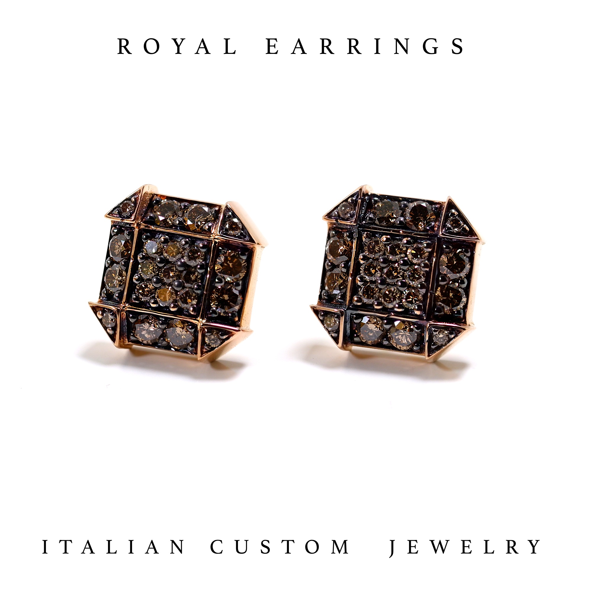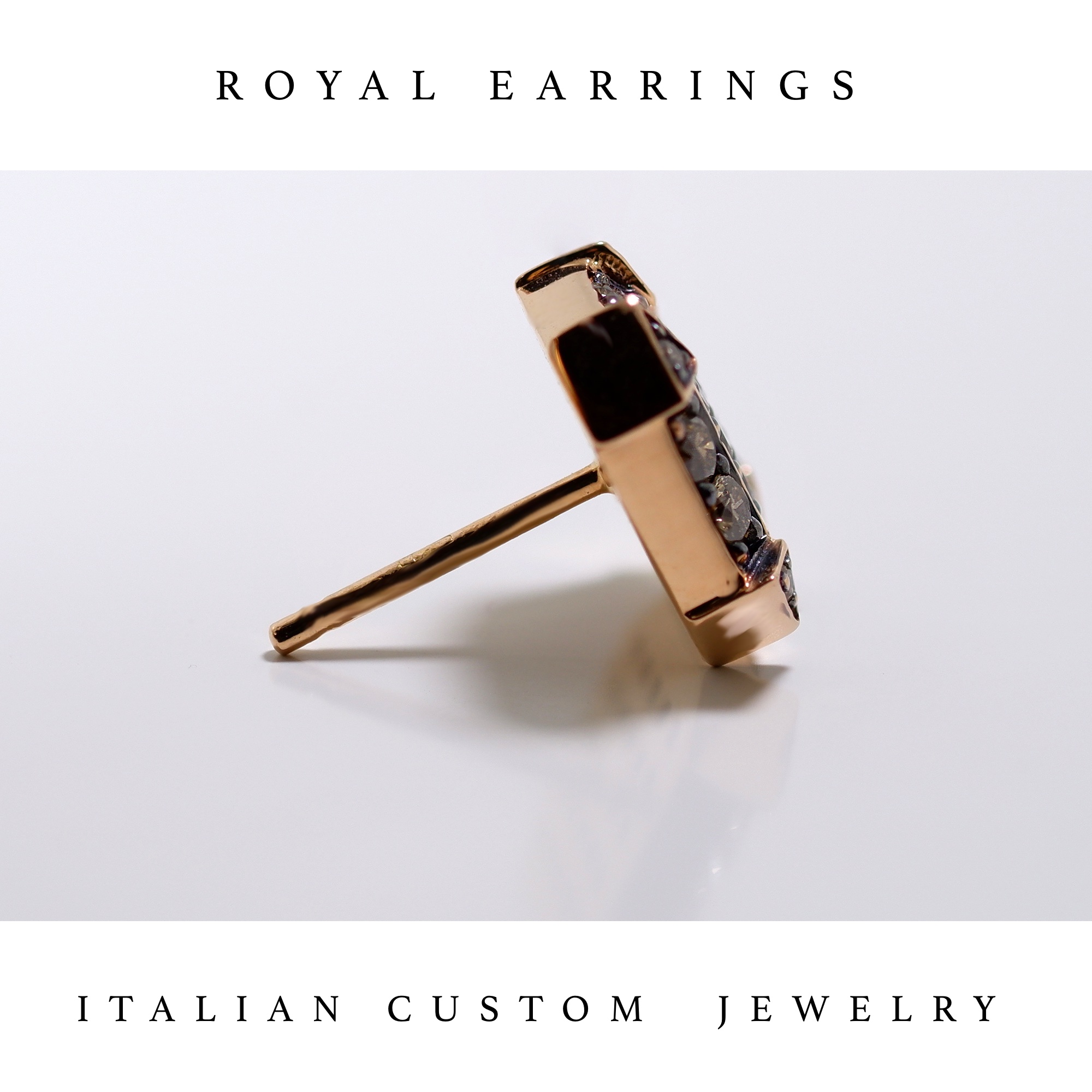 Royal Earrings is an elegant and luxury jewel unisex, gold made with brown diamonds setting is completely Handmade in Italy. Available other versions (white and black diamonds)