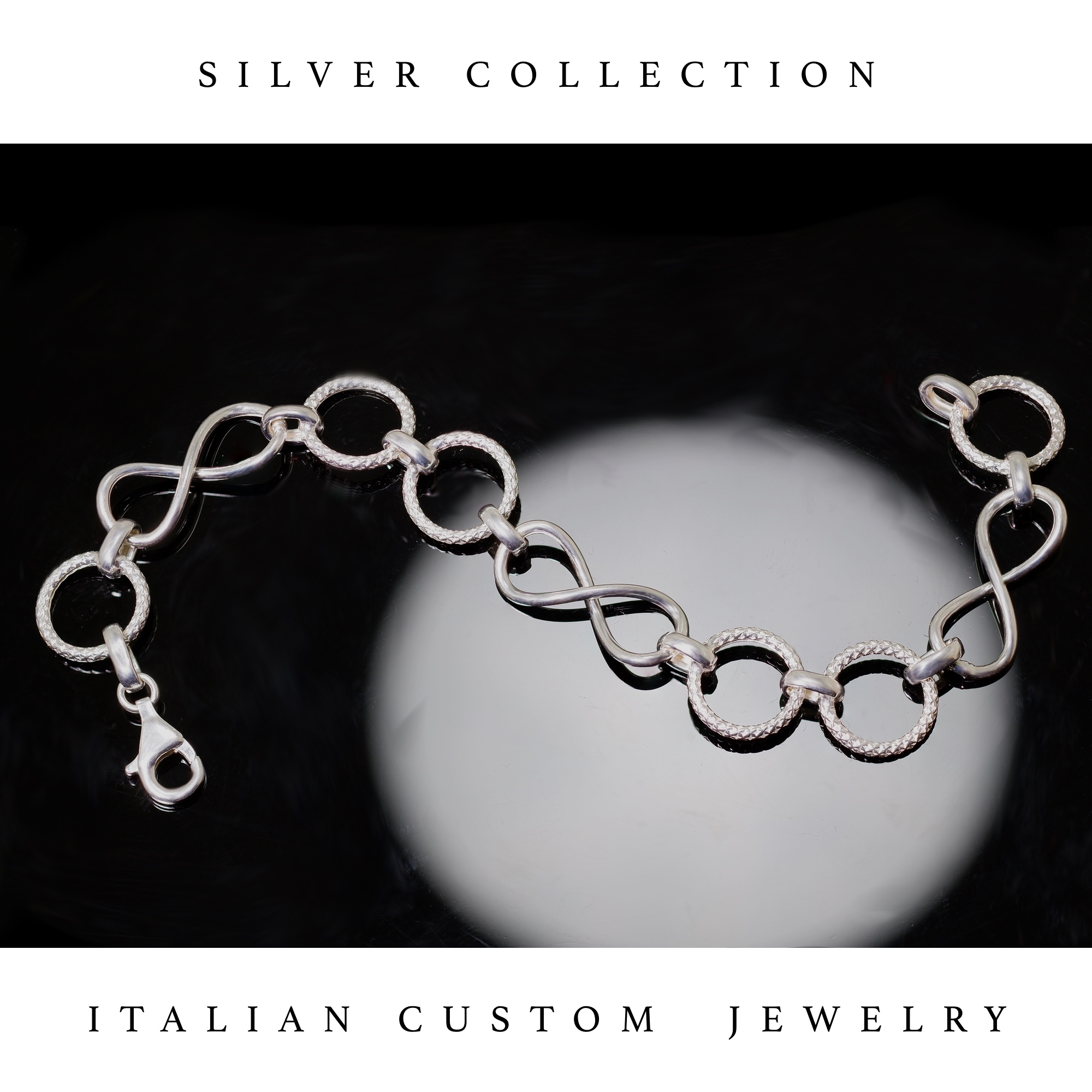 Bracciale femminile in argento color bianco con maglie a simbolo infinito legate fra loro Bracciale completamente realizzato a mano in Italia. Tempi di consegna entro 5 giorni lavorativi