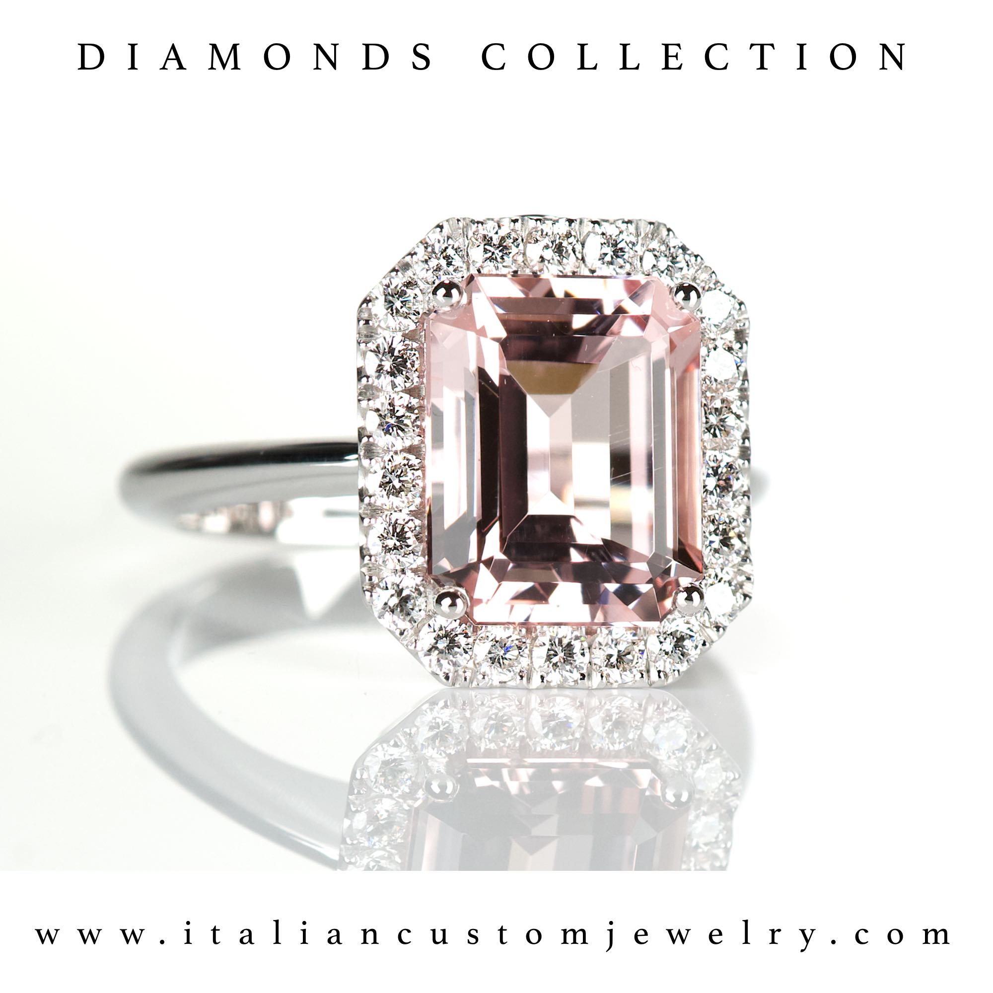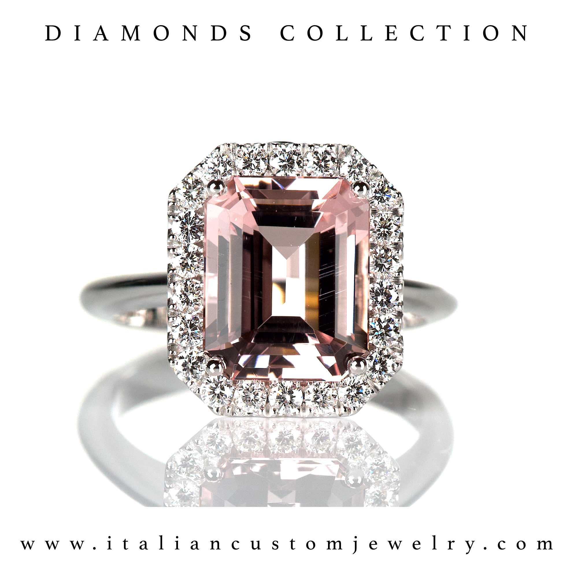 A wonderful ring completely handmade in Italy with natural diamonds setting and Morganite. The ring was made in our laboratories and comes with packaging and a guarantee certificate. For more information contact us. We will remotely carry out a check on the diamonds using a microscope and natural diamond detector. The size of central stone could be different respect this image, contact us before for more information. Shipping times within 5 working days. The price and carat weight of the stones are indicative, as the ring is handmade with natural stones and the weight of the stones varies each time.